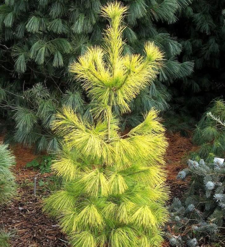 Хвоя: длинная, мягкая, растёт пучками по 5 штук. Яркая, жёлтая, в тени становится светло-зелёной.