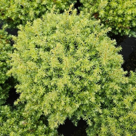 Побеги плотно покрыты мягкой чешуйчатой хвоей сизо-зелёного окраса.