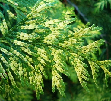 Крона в молодом возрасте достаточно рыхлая, с возрастом заметно уплотняется. Хвоя плотная, чешуйчатая, глянцевая, зелёная с жёлто-кремовыми полосами, зимой не буреет.