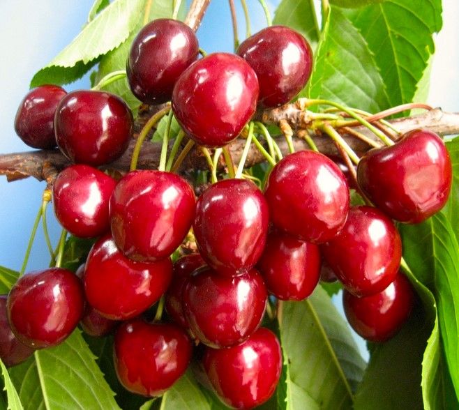 Белые бутоны цветут в конце марта. Соцветие напоминает по форме зонтик, состоит из 2–3 цветов. Плоды: средний размер, вес — около 5,3 г, форма — сердцевидная, окраска — тёмно-красная с блестящей кожицей, покрытой лёгким восковым налётом. Мякоть сочная, тёмно-красная, средней плотности. Ягоды отличаются сладким вкусом, дегустационная оценка — 4,8 балла. Подходят для свежего употребления и переработки (варенье, компоты, соки).
