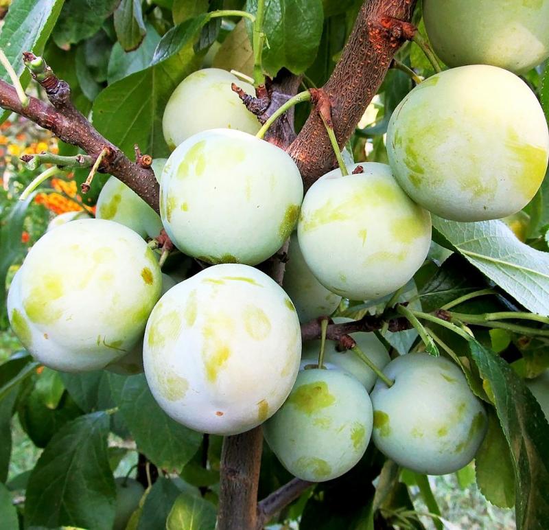 Плод: вес 40-45г, округлые, зеленовато-жёлтые с беловатым налётом.