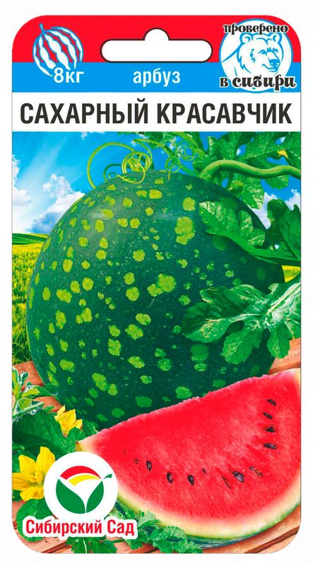 Растение среднеплетистое. Плоды округлоэллиптические, массой до 8 кг. Кожура с ярко-зелеными округлыми пятнами на темно-зеленом фоне. Кора средней толщины. Мякоть розовая, плотная, сочная сладкая. Урожайность до 8кг/м2
