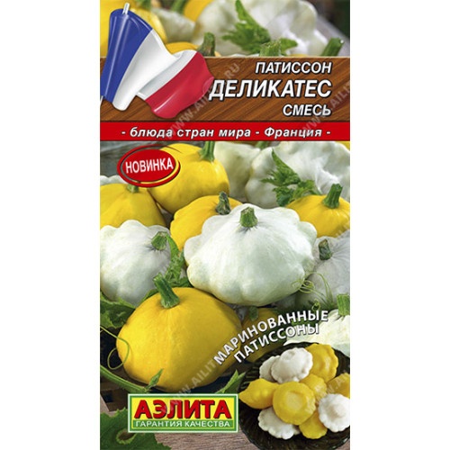 Смесь раннеспелых, высокоурожайных и неприхотливых патиссонов. В неё входят сор та: Зонтик – 50% (плоды белого цвета) и Карапуз® – 50% (плоды желтого цвета). От всходов до первого сбора 45-50 дней. Растения кустовые, компактные, одновременно формируют большое количество завязей. Плоды массой 80-340 г, с тонкой кожицей, нежной и очень плотной мякотью. Вкусовые качества превосходные. В кулинарии используются как кабачки и для маринования. Патиссоны отлично хранятся до конца декабря. Урожайность – 4-5 кг/м 2 .