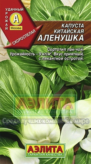 Популярный отечественный сорт китайской капусты, которая известна также как горчичная, или пак-чой. Ценится за скороспелость (45 дней от всходов) и высокое содержание лизина – незаменимой аминокислоты, редкой в овощах. Формирует прямостоячую розетку листьев диаметром 20-30 см. Листья с черешками употребляют в пищу свежими, жареными, тушёными и квашеными. Листья некрупные, округло-овальные, черешки мясистые, 8-14 см длиной. Масса одного растения 1-1,8 кг, масса черешков составляет 2/3 от массы растения. Урожайность высокая – 9 кг/м2. Вкус приятный, с пикантной остротой.