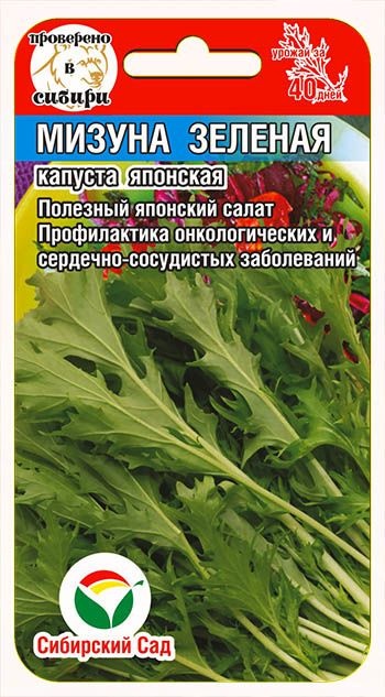 Однолетняя зеленная культура, японская листовая капуста МИЗУНА готова к употреблению уже через 40-45 дней после появления всходов. Очень полезна, богата биологически активными веществами и витаминами, содержит много каротина, витаминов С, В1, В2, РР, соли калия, кальция, фосфора, железа. Показана после весенних авитаминозов, для профилактики сердечно-сосудистых, онкологических заболеваний, язвы желудка.