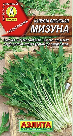 Среднеранний сорт листовой капусты. Первый сбор зелени можно проводить спустя три недели после всходов. Формирует крупные розетки массой 1-1,5 кг из 45-60 крупных листьев. Листья мизуны сочные, нежные, с пикантным, слабогорчичным вкусом. Прекрасно подходят для различных салатов, бутербродов и блюд из морепродуктов. Регулярное употребление японской капусты повышает сопротивляемость организма инфекциям, препятствует развитию онкологических заболеваний, улучшает состав крови. Сорт достаточно холодо- и жаростойкий. Урожайность 6-7 кг/м2.