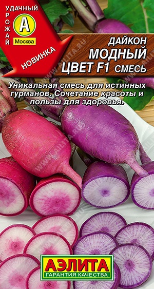 Особенная смесь гибридов дайкона для настоящих гурманов! Отличный ингредиент любой диеты. Сочетание пользы и красоты. Урожай готов к уборке через 65-70 дней после посева семян. Корнеплоды длиной 12-15 см, массой 120-180 г. Мякоть с яркой сердцевиной, аппетитная, сочная, сбалансированного вкуса. Смесь неприхотливая, устойчивая к заболеваниям, идеальная для приготовления свежих салатов.