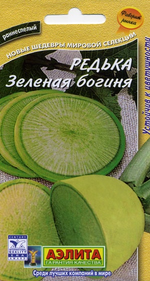 Очень популярный сорт. Не имеет равных по скороспелости, продуктивности и вкусовым качествам. Формирует урожай за 60-63 дня от всходов. Корнеплоды массой 350-400 г, гладкие, с нежной, сочной, изумрудно-белой мякотью. Вкус сладкий с легкой остринкой, без горечи. Салаты из редьки – вкусное и эффективное противовирусное лекарство, они укрепляют иммунитет, восполняют дефицит витаминов и минеральных солей в организме. Корнеплоды хорошо хранятся зимой. Урожайность 5-6 кг/м2.