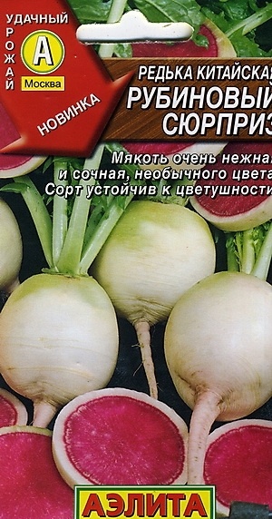 Популярная разновидность с мякотью красного цвета, известная как арбузная редька. Сорт раннеспелый, от всходов до начала хозяйственной годности 60- 65 дней. Корнеплоды массой 200-240 г. Мякоть сочная, с пряным ароматом. Вкус более нежный, чем у черной редьки, и более жгучий, чем у дайкона. Рекомендуется употреблять в свежем виде, в составе овощных салатов и гарниров. Урожайность 4-5 кг/м2. Сорт подходит для непродолжительного хранения.