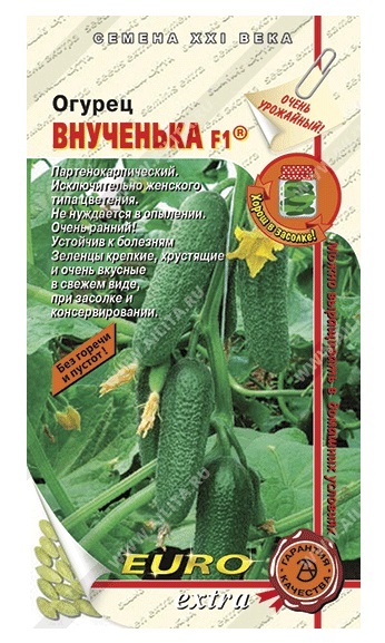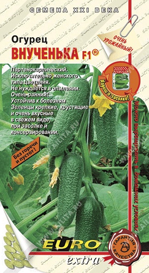 Очень ранний партенокарпический гибрид для открытого грунта, пленочных и стеклянных теплиц. Не нуждается в опылении. Исключительно женского типа цветения. Отличительные свойства: увеличенный период плодоношения, суперурожайность, высокая товарность плодов. Устойчив к вирусу огуречной мозаики, оливковой пятнистости, настоящей мучнистой росе, толерантен к ложной мучнистой росе. Растение среднеплетистое. Зеленец крепкий, хрустящий, мелкобугорчатый, овально-цилиндрический, масса 80-92 г, длина 7,9-9,8 см, соотношение длины к диаметру 3,2:1. Не содержит горечи. Прекрасные вкусовые качества при употреблении в свежем виде, а также при консервировании и засолке. ООО «АПФА» является эксклюзивным продавцом гибрида огурца «Внученька F1®» на рынке семян.