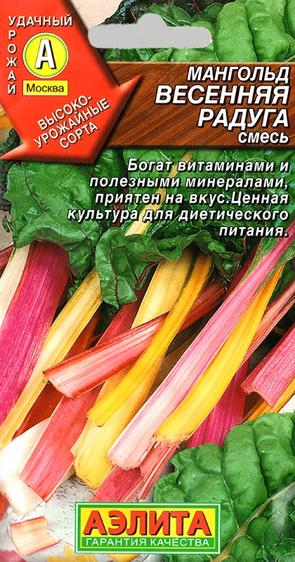 Яркая и полезная для здоровья смесь сортов для открытого и защищенного грунта. Включает: мангольд Алый, Зеленый, Изумруд и Невеста. Рекомендуется для использования в домашней кулинарии молодых листьев и черешков. Начало хозяйственной годности наступает через 40-55 дней от всходов. Розетки листьев вертикальные, компактные, высотой 50-60 см. Урожайность зеленой массы 4-5 кг/м2. Сорта засухо- и холодоустойчивые. Обладают высокой декоративностью и могут использоваться для оформления садового участка.