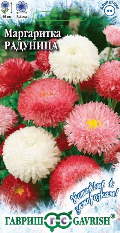 Неприхотливое, очень зимостойкое растение из семейства Астровые высотой 15 см. Цветет в апреле-июле, при хорошем уходе цветение продолжается до осени с перерывом в жаркий период сезона. Соцветия 3-6 см в диаметре белой, розовой, красной окраски. Хорошо растет на любых почвах. Светолюбивое растение, но хорошо выдерживает легкое затенение. Семена высевают в конце июня - начале июля в открытый грунт, всходы появляются через 7-10 дней. Маргаритка прекрасно подходит для выращивания на клумбах, рабатках и в бордюрах, а также в горшках и балконных ящиках.