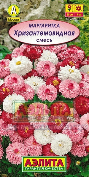 Роскошная смесь маргариток с очаровательными, махровыми соцветиями диаметром 4-5 см. Растение формирует компактную прикорневую розетку листьев с цветоносами высотой 15-20 см. Многолетнее и зимостойкое по природе, в цветоводстве оно часто используется в качестве двулетнего. Смесь подойдет для контейнерного озеленения, оформления ярких бордюров в саду, окаймления небольших водоемов. Пушистые «шапочки» маргариток украсят альпийские горки, низкорослые садовые цветники.