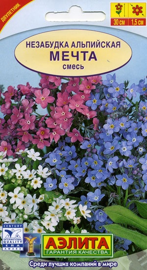 Великолепный, неприхотливый, зимостойкий двулетник. Кустики компактные, высотой 20-30 см. Мелкие цветочки диаметром 1,5 см собраны в рыхлые соцветия-завитки. Цветение очень обильное, около 50 дней. Смесь рекомендуется для оформления весенних цветников (подбивка тюльпанов и нарциссов), окантовки декоративных водоемов, для мавританского газона и контейнерной культуры.