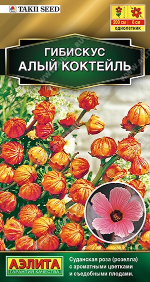 Эффектный кустарник от компании TAKII SEED (Япония) с однолетним циклом развития. Известен также как суданская роза или розелла. В южных регионах отлично растет в открытом грунте, достигая высоты 2 м. В условиях средней полосы рекомендуется для горшечной культуры дома или в теплое время года в саду. Цветки ароматные, крупные – диаметром 6 см. После увядания лепестков чашечки разрастаются, становятся сочными, мясистыми, яркого оттенка. Они имеют кисло-сладкий вкус и используются для приготовления чая каркадэ, цукатов, джема, фруктовых салатов и напитков.