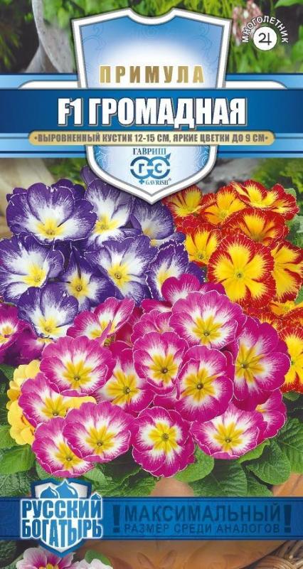 Травянистая многолетняя раннецветущая смесь примул с невероятно крупными цветками фантастических двух- и трёхцветных окрасок итальянской серии «Грандиссима». Эти гибриды по праву считаются лучшими для производителей качественных примул. Образуют компактный и очень выровненный кустик высотой 12-15 см усыпанный яркими цветками диаметром 6-7 (до 9!) см. Хорошо растут в полутенистых местах, на удобренной, достаточно увлажненной почве. Легко переносят пересадку даже во время цветения. Семена высевают в открытый грунт осенью или весной после стратификации во влажном песке при низкой положительной температуре, в течение 3-4 недель. При температуре почвы +10°С всходы появляются через 25 дней. На постоянное место высаживают весной или осенью второго года. Высаживать примулу надо с таким расчетом, чтобы посадки были сомкнутыми, а между розетками листьев не было открытого пространства. Молодые растения зацветают на второй год. Цветение продолжительное, с апреля по июль. Используют для посадки в бордюры, каменные горки.