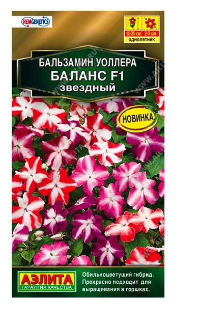 Впечатляющий «звездный» цветочный ковер – украшение любого сада или комнаты! Бальзамины серии Баланс отличаются обильным продолжительным цветением. Цветки изящные, очень яркие, диаметром 2-3 см, не опадают длительное время. Кустики высотой 15-25 см, компактные, хорошо разветвленные. Бальзамин неприхотлив, не требователен к освещению. Сохраняет при этом красочное пышное цветение, а стебли не вытягиваются в длину. Гибрид идеально подходит для высадки в балконные контейнеры, украшения низкорослых клумб, окаймления садовых дорожек.