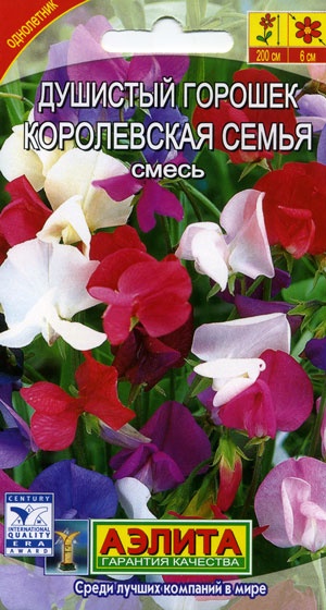 Самая популярная смесь сортов душистого горошка группы Королевская семья. Растения быстрорастущие, с прочными лазающими стеблями высотой до 250 см. Душистые цветки диаметром 3-4 см собраны в кисти по 5-7 шт. В жару цветки не мельчают, цветение не прекращается. Используется для оформления беседок, террас, балконов и для срезки.