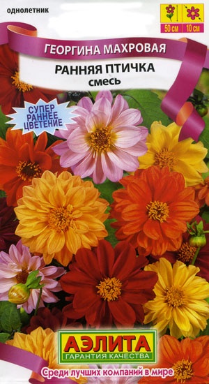 Быстрорастущая смесь низкорослых махровых георгин с очень ранним, обильным и длительным цветением. На кустах до 50 см высотой распускается множество соцветий Ø 5-7 см на крепких цветоносах. Растения прекрасно смотрятся в бордюрах, подходят для создания массивов. Замечательный сорт для выращивания в контейнерах и садовых вазах.