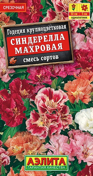 Цветущий куст годеции Синдерелла напоминает шикарный букет. Это изящное, стройное растение высотой 30-50 см. Украшено густой листвой и крупными (Ø 4-5 см), преимущественно полумахровыми и махровыми цветками с шелковистым блеском. Смесь без труда впишется в любой садовый ансамбль – украсит рабатки, клумбы, контейнеры. Подходит для срезки в букеты.