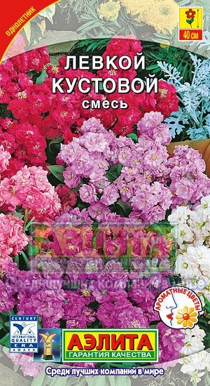 Обильноцветущая махровая смесь с велико лепным ароматом. Кусты левкоев компактные, разветвленные, высотой 30-40 см. Цветки крупные, махровые, диаметром 3-4 см, собраны в короткие, пышные кисти. Из-за особенностей семеноводства левкоя могут присутствовать растения с немахровыми цветками. Одно растение – это целый букет из 5-10 соцветий. Цветение раннее и продолжительное. Растения отлично подходят для солнечных цветников, балконов, контейнерного оформления мест отдыха. Душистые соцветия пригодны для срезки в небольшие букеты.