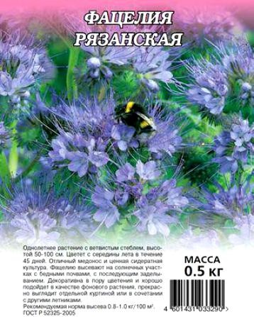 Однолетнее растение из семейства Водолистниковые с ветвистым стеблем, высотой 50-100 см. Отличается быстрым ростом и накоплением большого количества зеленой массы, поэтому является отличной сидератной культурой. Корневая система фацелии глубоко проникает в почву, улучшая ее структуру. Цветет с середины лета в течение 45 дней. Отличный медонос. Фацелия очень декоративна в пору цветения и хорошо подойдет в качестве фонового растения, прекрасно выглядит отдельной куртиной или в сочетании с другими летниками. Фацелию высевают с ранней весны до осени (оптимальный срок июнь-июль) на глубину 2-3 см на солнечных участках с бедными почвами, с последующим заделыванием. Норма высева 0,8-1,0 кг/100 м2.
