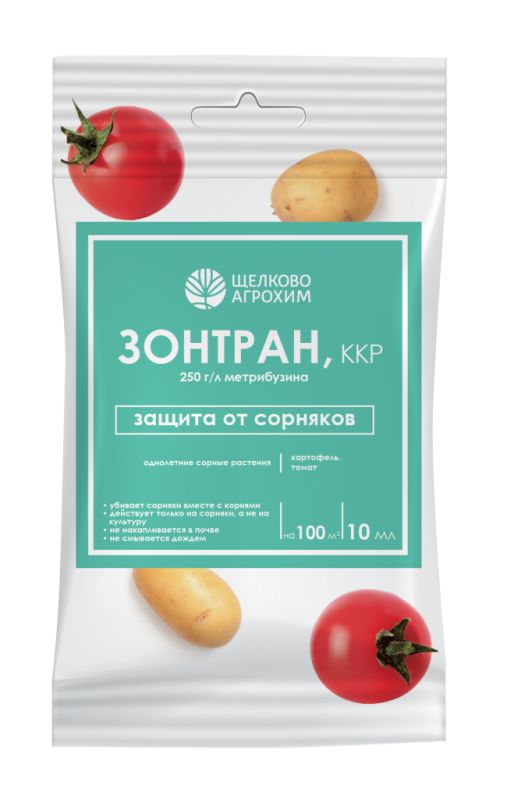 Средство от сорняков «Зонтран, ККР» – контактный гербицид для уничтожения широкого спектра двудольных и злаковых сорняков на посевах картофеля и томатов. Уничтожает более 50 видов сорняков и образует защитный экран, не смываемый дождем. Препарат поглощается листьями и корневой системой прорастающих сорняков, угнетает чувствительные сорняки. Видимые симптомы воздействия на сорняки — через 2–7 дней, гибель сорняков – через 10-15 дней после опрыскивания. Обеспечивает чистоту посадок от чувствительных сорняков на один месяц.