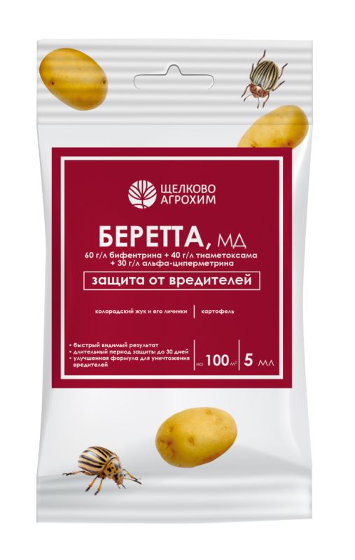Инсектицид «Беретта, МД» – один из самых современных и эффективных препаратов от колорадского жука. Препарат эффективно воздействует на все стадии развития насекомых, включая обитающих на обратной стороне листа и скрытноживущих. В составе препарата три действующих вещества, каждое из которых за счёт различия свойств действует на вредителей по-своему: если вредитель устоит против одного компонента, то гибель наступит от двух других. После обработки раствор легко проникает внутрь растения и отлично закрепляется на теле насекомого, усиливая контактное действие. «Беретта, МД» устойчив к смыванию осадками и испарению с обработанной поверхности. Всё это обеспечивает длительный период защиты картофельных посадок – до 35 дней.