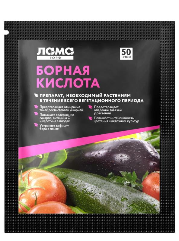 Борная кислоты – источник важного для растений микроэлемента бора. При недостатке этого вещества замедляется рост растений и ухудшается их плодоношение. Борная кислота применяется для повышения содержания в плодах витамина С, каротина, углеводов, а также используется для увеличения интенсивности цветения и завязи.