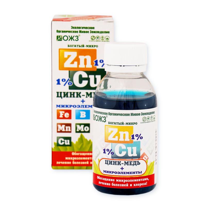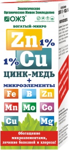 Богатый - микро ZnCu (цинк 1% + медь 1% + микроэлементы) - 0,1л., жидкость. Состав: Zn-1%, Cu-1%, Mn-0,018%, Fe-0,02%, Co-0,0008%, B-0,0014%, Mo-0,004%, Mg-0,0025% в хелатной форме.