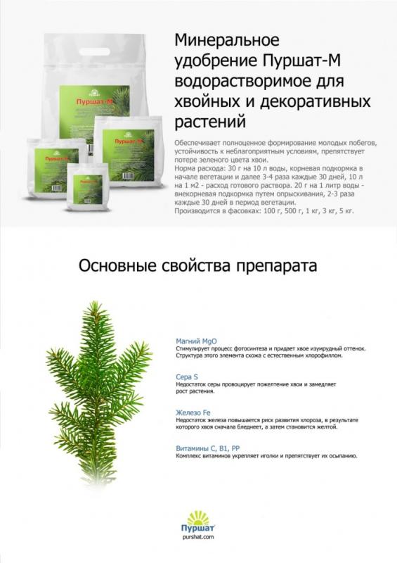 Сроки и нормы для раствора: Внекорневая подкормка – 20 г на 1 л воды-вносится путем опрыскивания растений до полного смачивания хвои 2 или 3 раза в месяц.