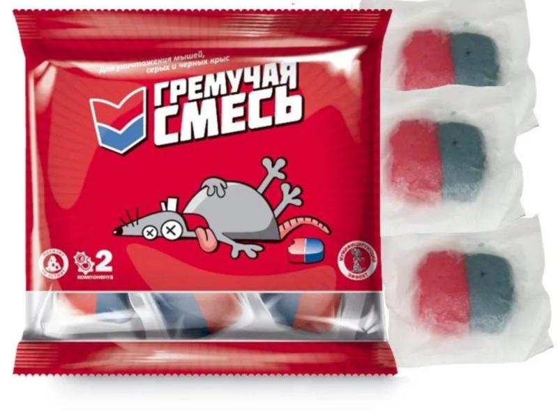 Родентицидное средство Гремучая смесь - это готовая к применению пищевая тестообразная приманка красного и синего цвета в равных долях.